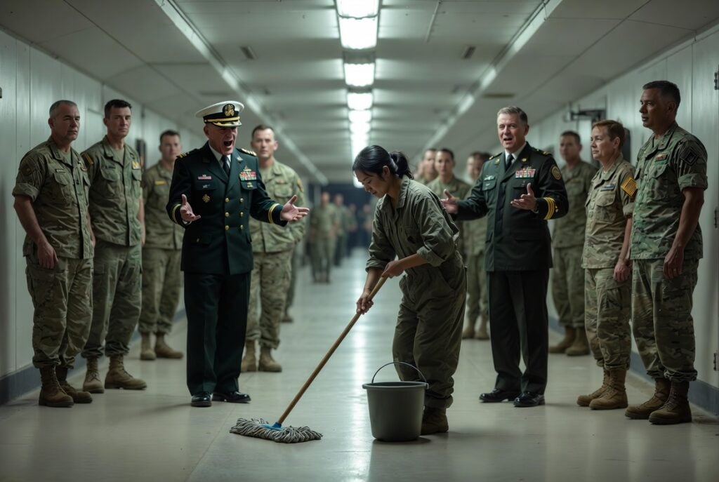 The woman they were mocking didn’t look up. Small, maybe 5’4, wearing the standard maintenance crew uniform that hung loose on her frame, she continued pushing her mop across the floor in steady, methodical strokes. Her dark hair was pulled back in a simple ponytail. Nothing about her suggested she was anything other than what she appeared to be, just another invisible worker keeping the base clean.