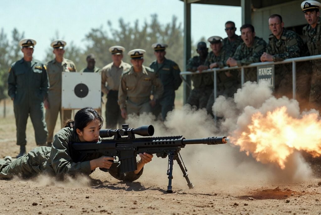 She loaded a single round, settled into prone position and looked through the scope. Her breathing slowed, steadied. 10 seconds passed. 15. She was reading the wind, calculating drop, measuring every variable. The shot cracked like thunder. 800 meters down range, the center of the target exploded. Kowalski checked through the spotting scope. “Dead center. Holy cow.”