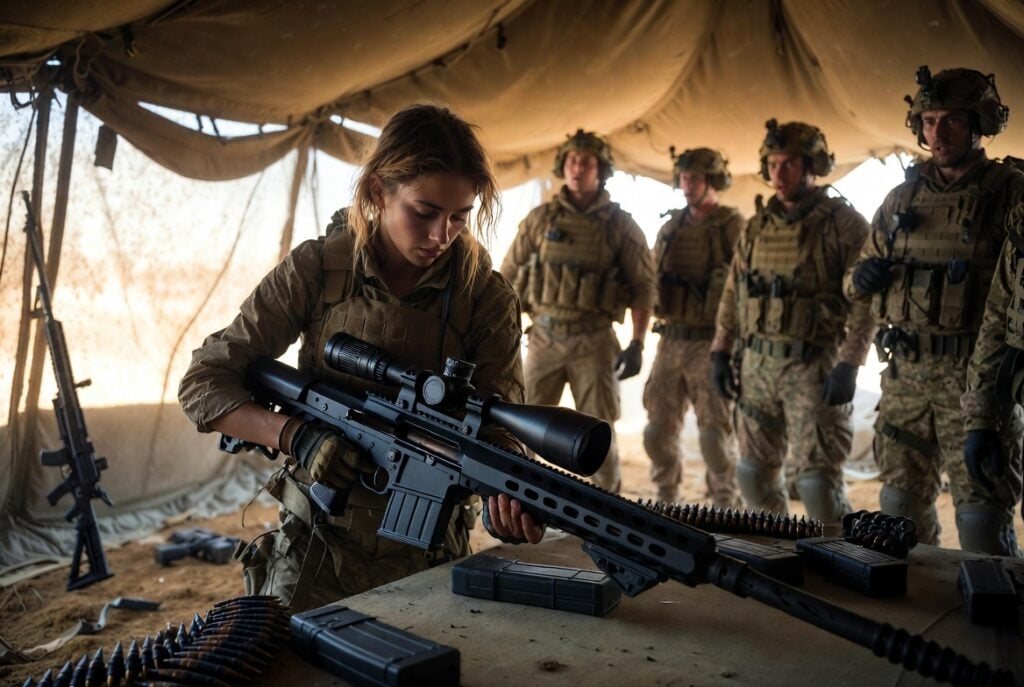 Specialist Chen, the FOB’s armorer, watched with his mouth hanging open. “Holy…” He caught himself. “I’ve seen SEAL snipers take longer.” Sarah lifted the fully assembled Barrett, checked the chamber, loaded a five-round magazine, and carried the 30-pound rifle to the firing line like it weighed nothing.