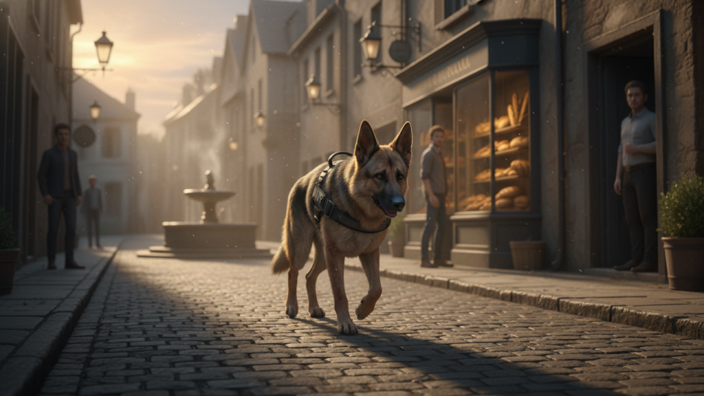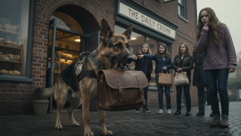 On a balmy afternoon in a small town, the local bakery became the stage for an extraordinary encounter. As the bell above the door chimed, a battered figure appeared on the horizon. The weary German Shepherd limped toward the bakery, his three legs struggling against the weight of a torn satchel clamped gently in his mouth. Visible scars marred his coat, and dried blood clung to wounds on his side. He approached slowly, yet with a resolute determination that belied the pain etched across his face.